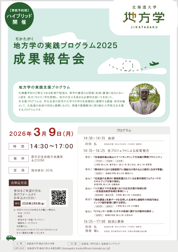 地域自治体と連携した研究に取り組む、大学院生を支援対象とする「地方学(ぢかたがく)の実践支援プログラム2025」の成果報告会を、北海道庁との共催で開催いたします。